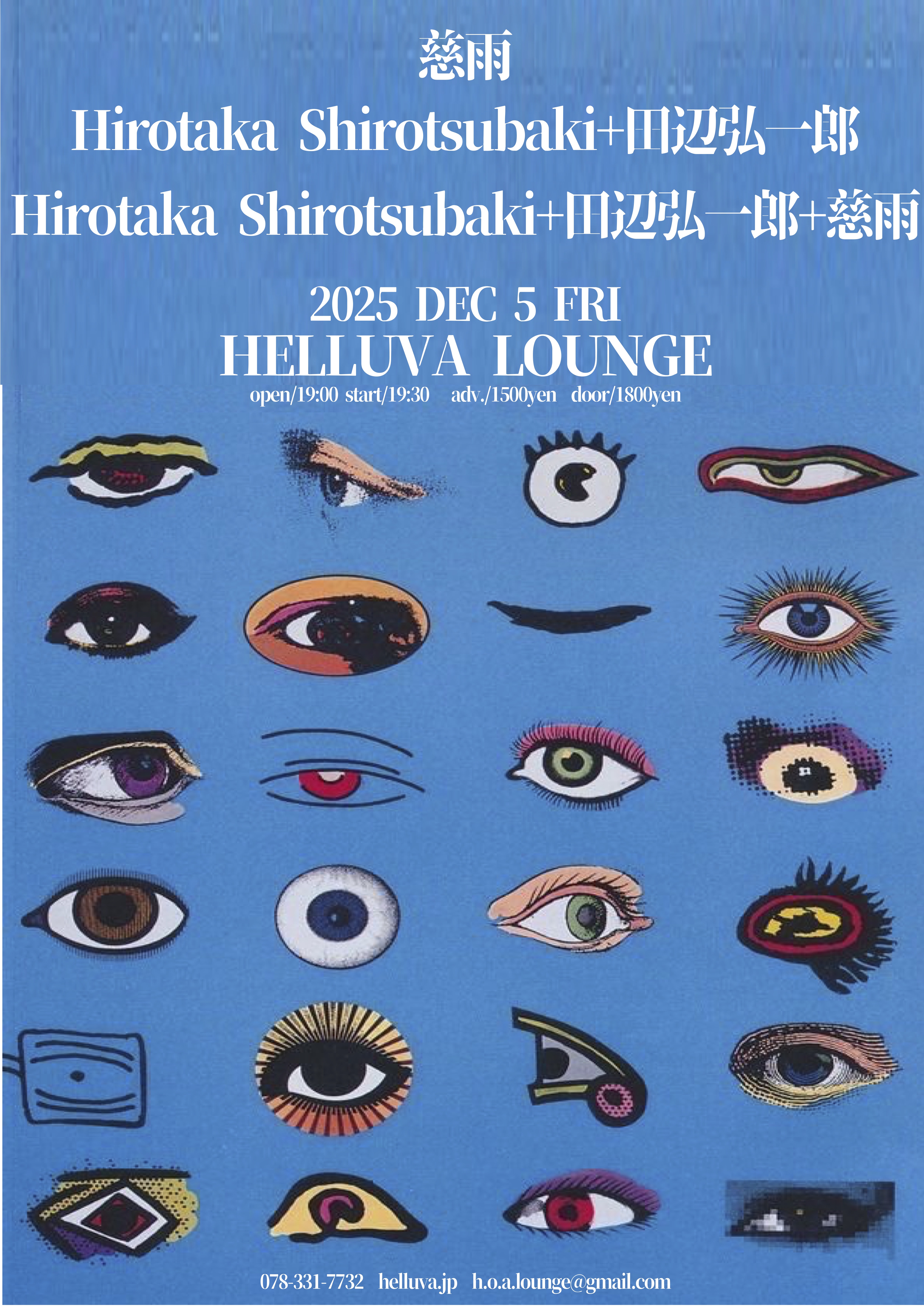 HELLUVA LOUNGE presents 2025年11月19日 Calendar いつ: 2025年12月5日 全日 2025-12-05T00:00:00+09:00 2025-12-06T00:00:00+09:00 料金: 無料 starring… ・慈雨 ・Hirotaka Shirotsubaki+田辺弘一郎 ・Hirotaka Shirotsubaki+田辺弘一郎+慈雨 OPEN/19:00 START/19:30 ADV./1500yen DOOR/1800yen チケット予約をご希望の方は ・公演日程 ・予約枚数 ・お名前 ・ご連絡先 を明記の上、以下のアドレスにメール頂くか、お電話にてお問合せ下さい。 h.o.a.lounge@gmail.com Phone : 078-331-7732